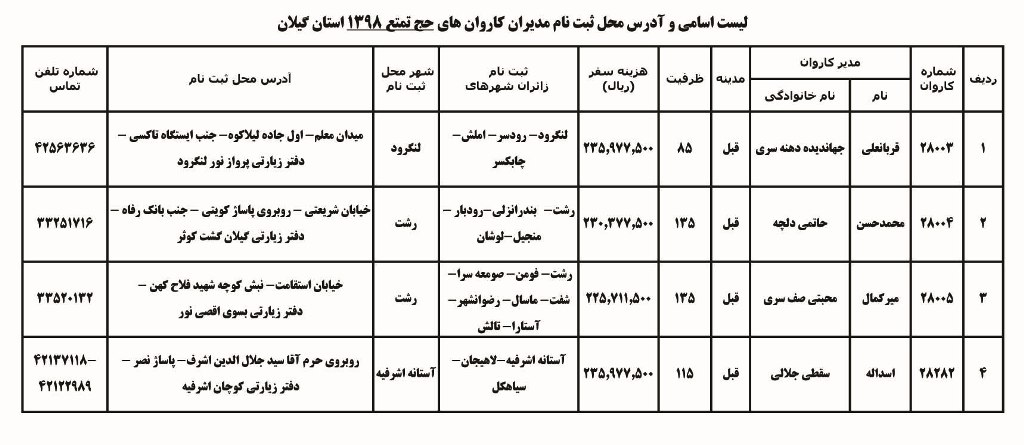 اعلام اسامی، نشانی و تلفن دفاتر ثبت نام مدیران و مشخصات کاروانهای حج تمتع در سطح استان